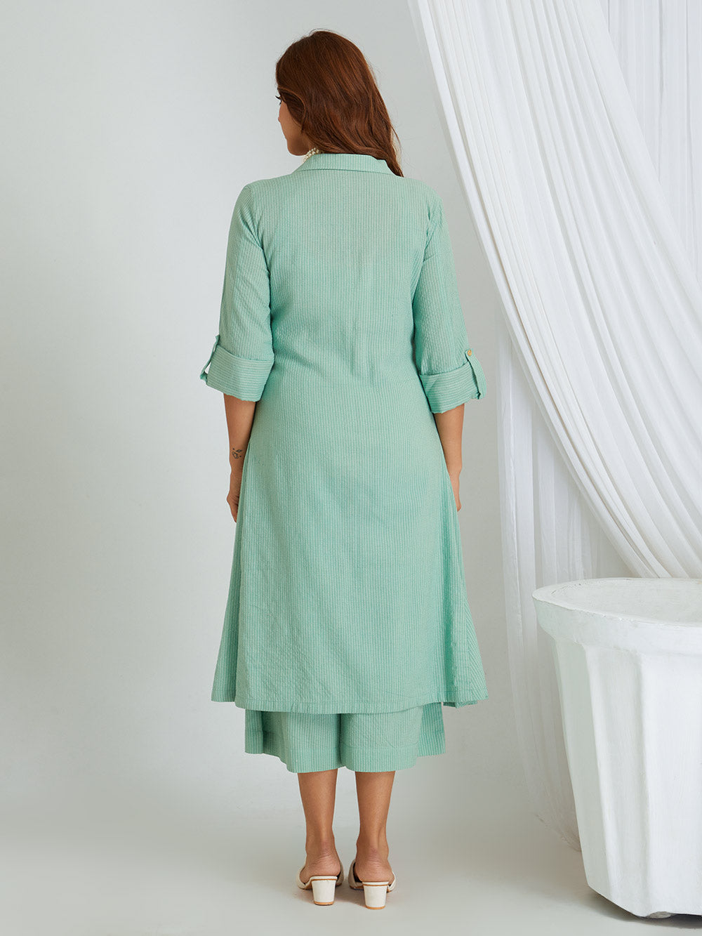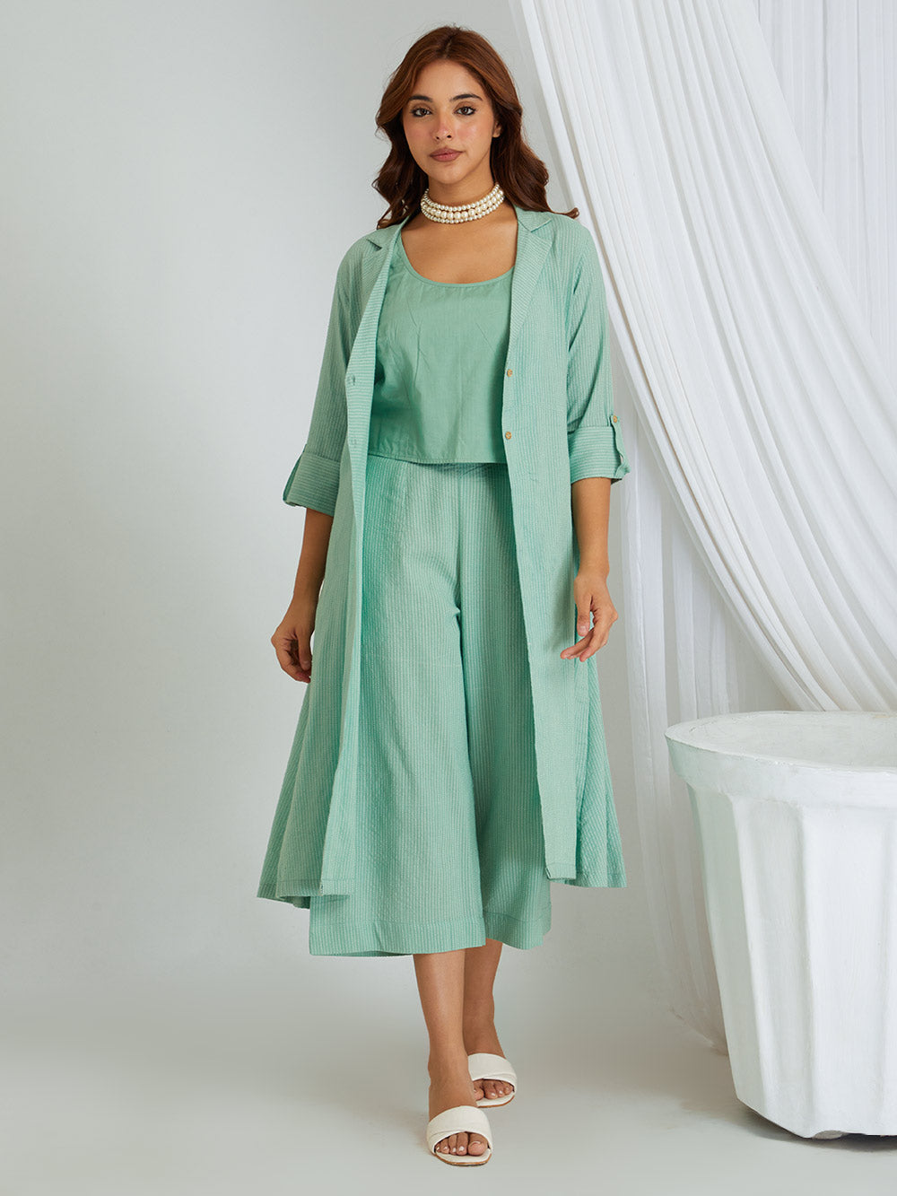 This three piece set include kurta cum shrug with slip and pants .