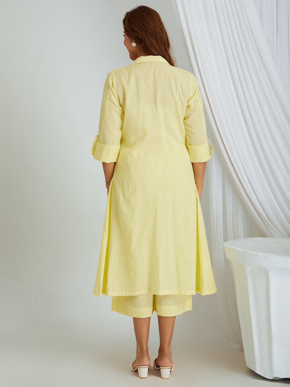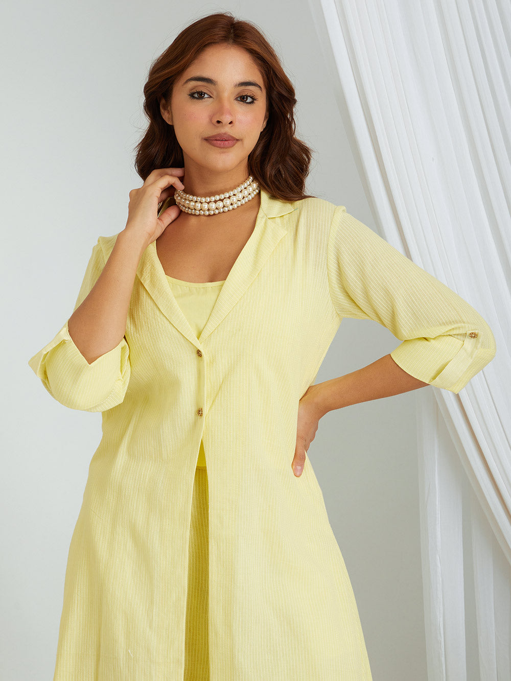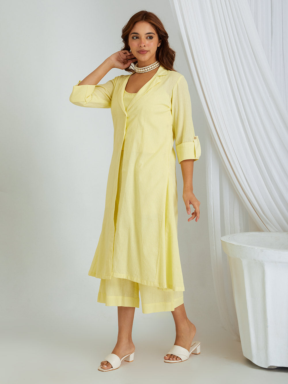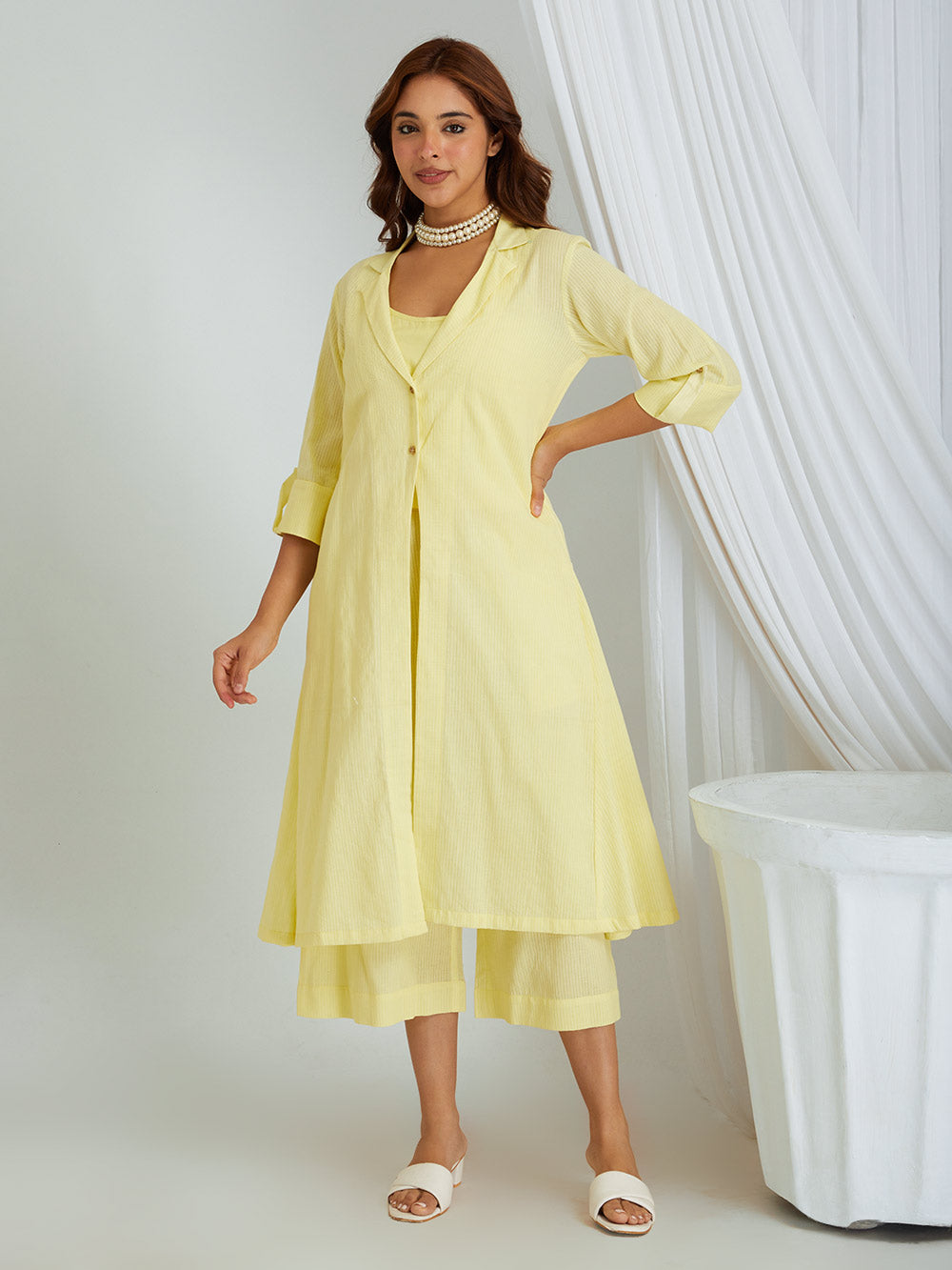 This three piece set include kurta cum shrug with slip and pants .