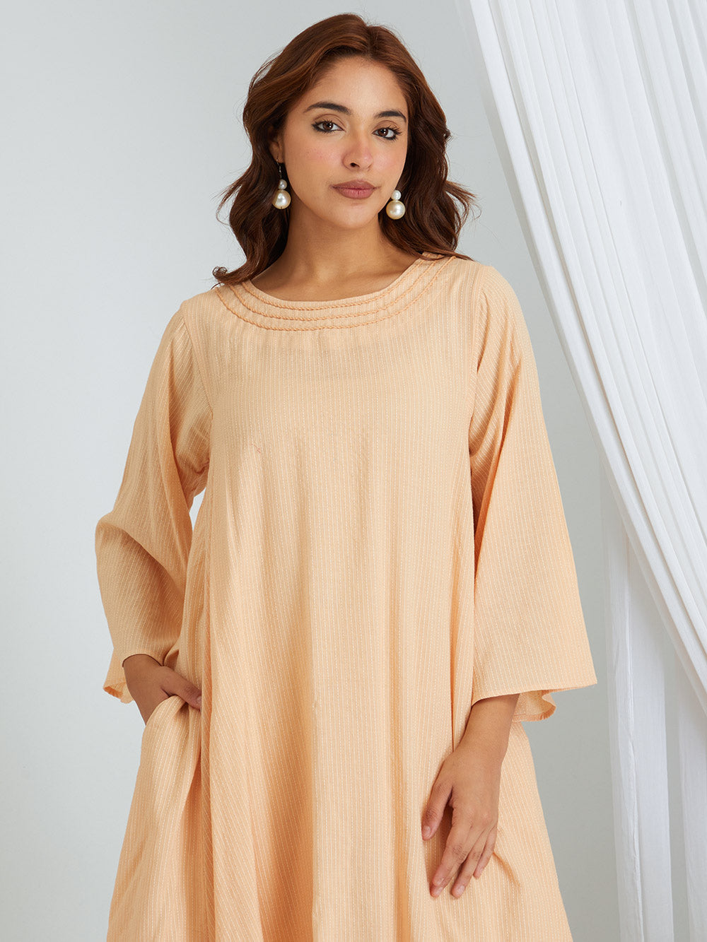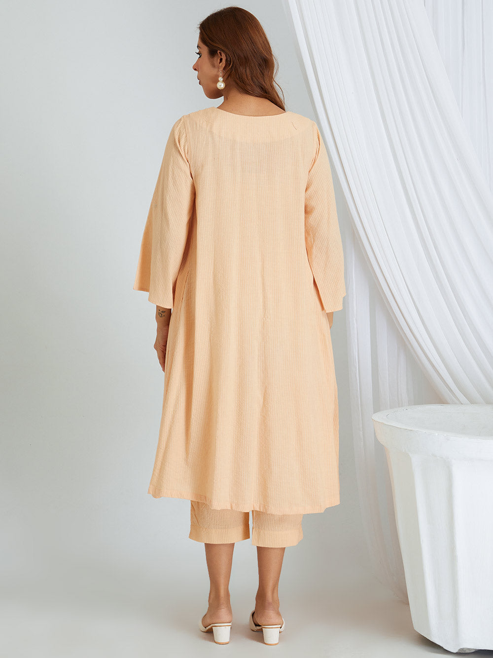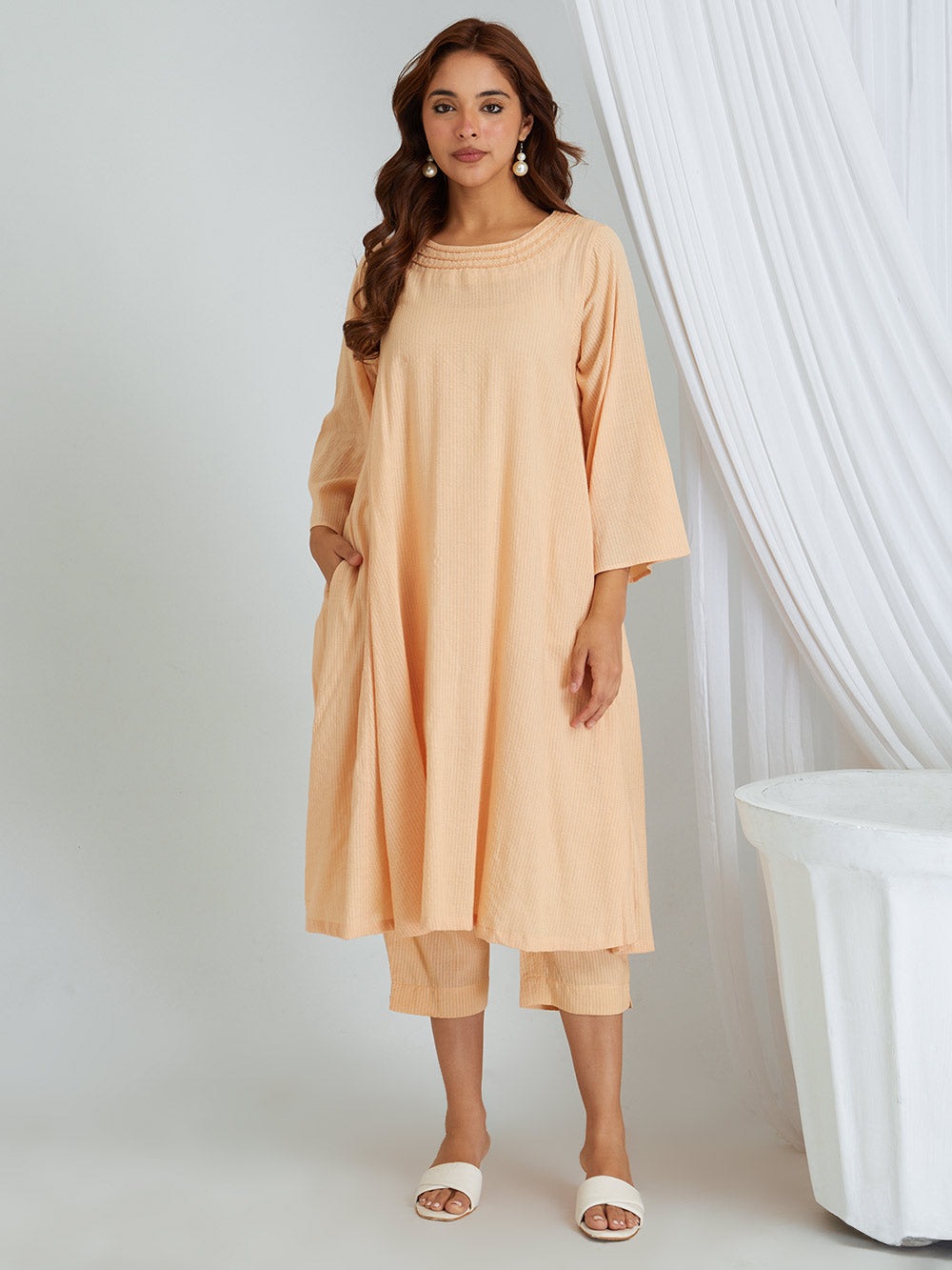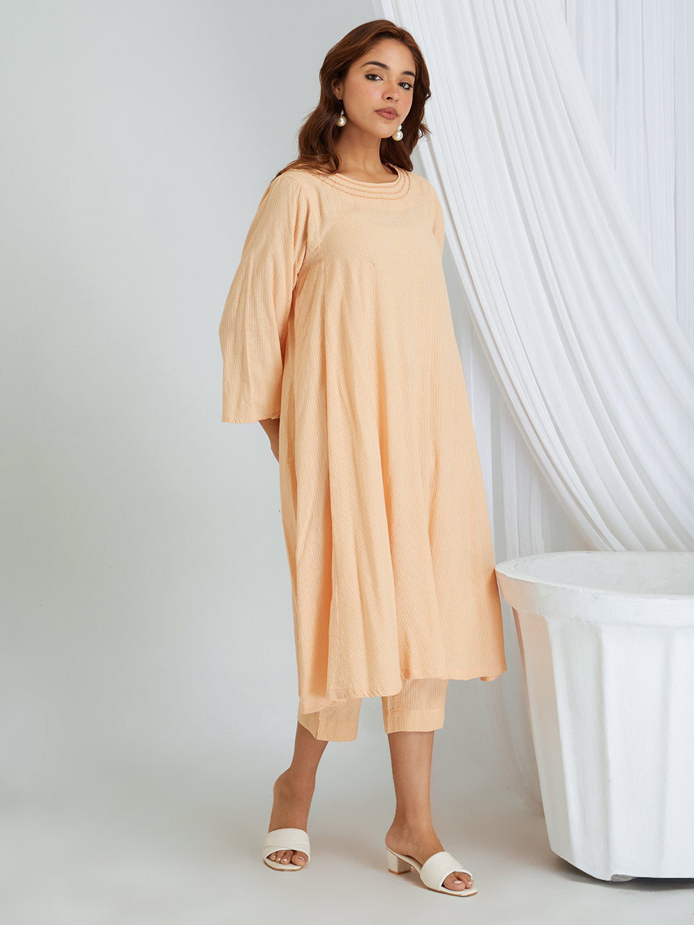 The Kantha Weaving Cotton Kurta is round neck and the neck is finish with hand made dori design and the kurta armhole cut is different and kali flared style and the 3/4 sleeves on th e kurta. The Kantha Weaving Cotton Pant is full elasticed and both side pockets on the pant.