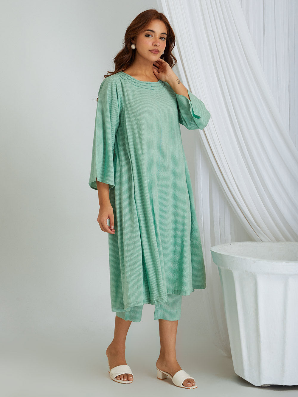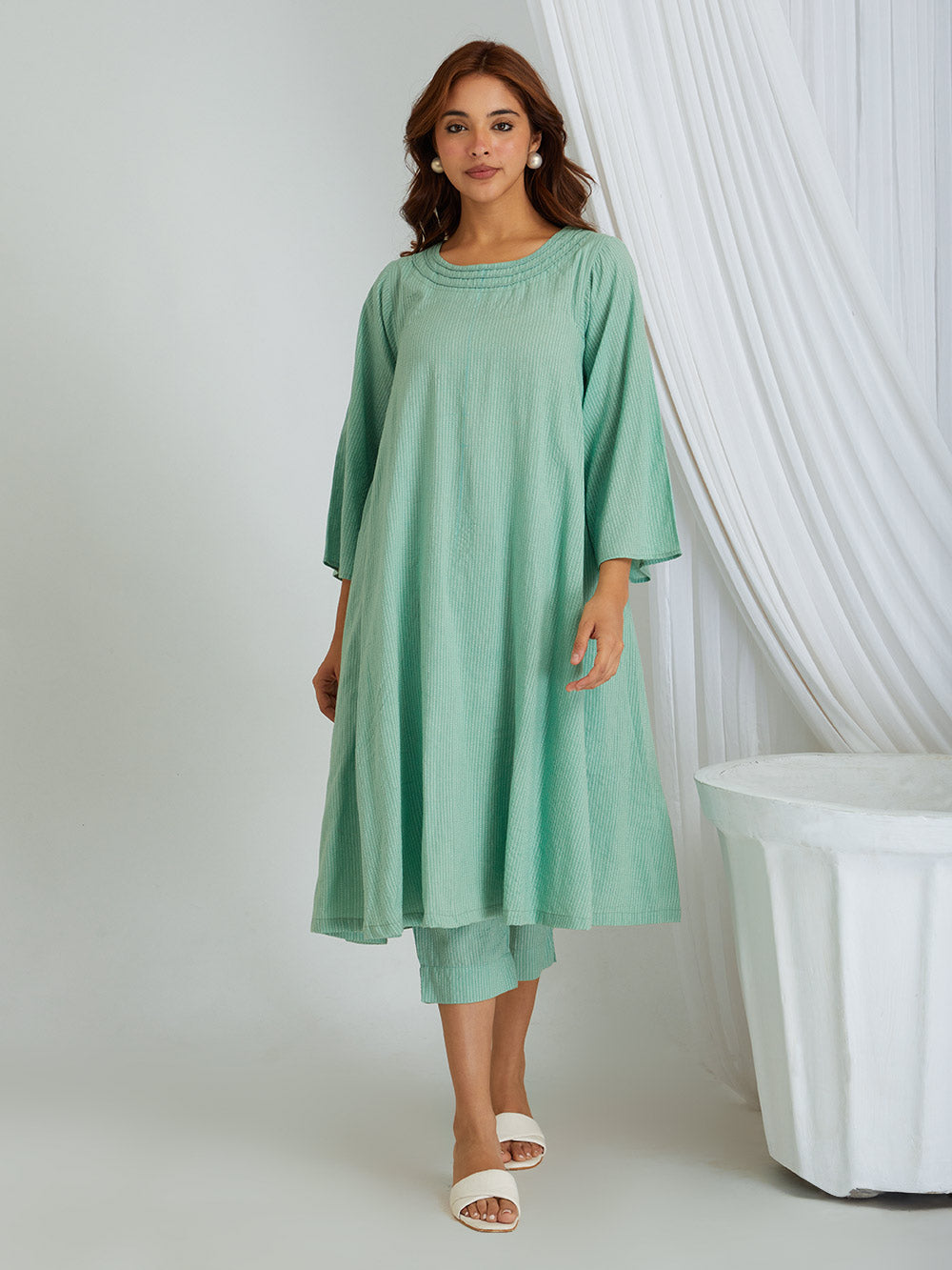 The Kantha Weaving Cotton Kurta is round neck and the neck is finish with hand made dori design and the kurta armhole cut is different and kali flared style and the 3/4 sleeves on th e kurta. The Kantha Weaving Cotton Pant is full elasticed and both side pockets on the pant.